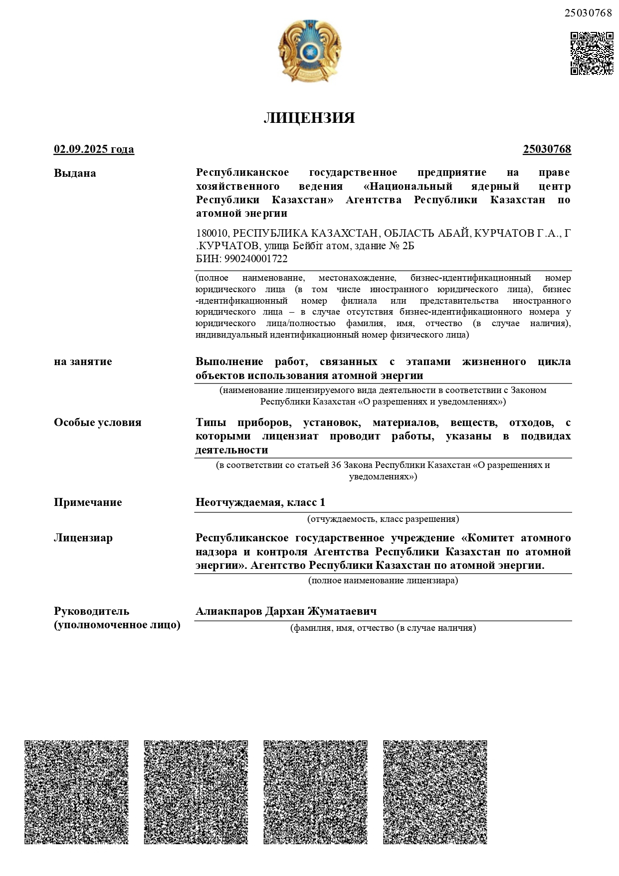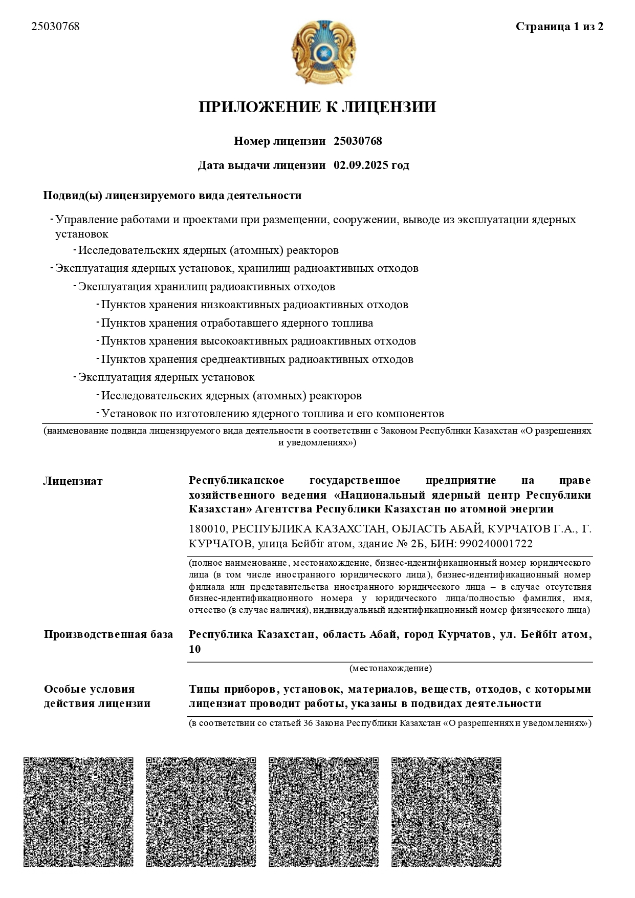 The CAESC ME RK license “Implementation of Works Related to the Life Cycle Stages of Nuclear Power Facilities” No. 20002096 dated 04.02.2020: