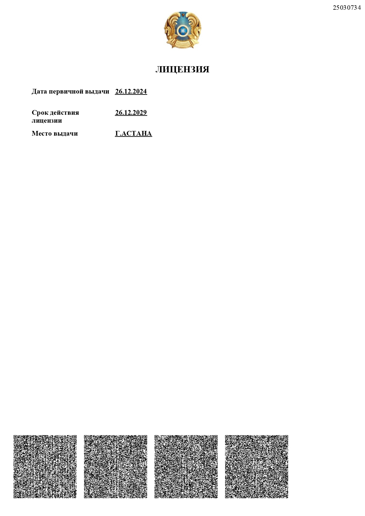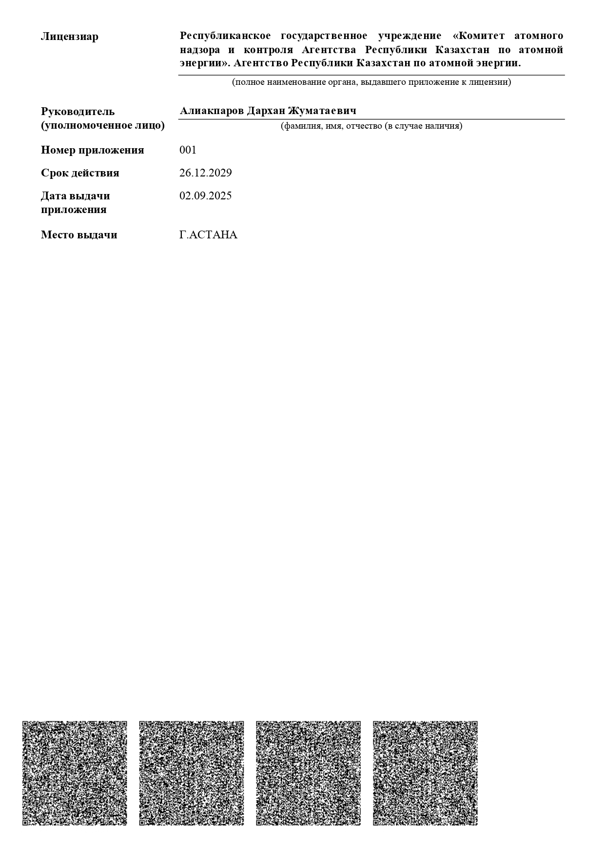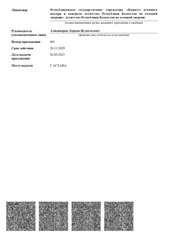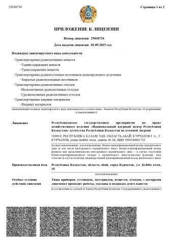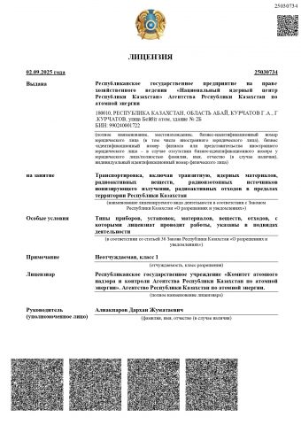 The CAESC ME RK license “Transportation, including Transit, of Nuclear Materials, Radioactive Substances, Radioisotope Ionizing Radiation Sources, Radioactive Waste within the Territory of the Republic of Kazakhstan” No. 20001655 dated 29.01.2020: